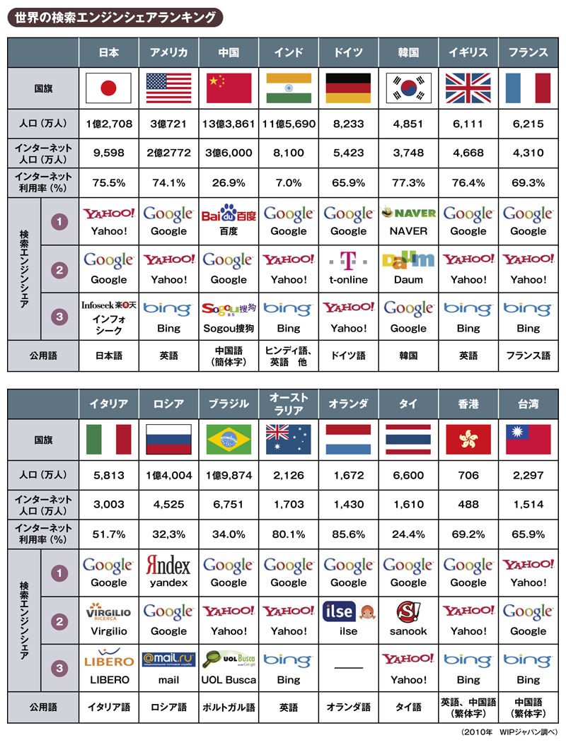 大まかに言えば、欧米圏ではほとんどの国でGoogleが80~90%という圧倒的なシェアを有していますが、中国・韓国・ロシアなど新興国と呼ばれる国々では、自国発祥の検索エンジンが強い支持を受けています。