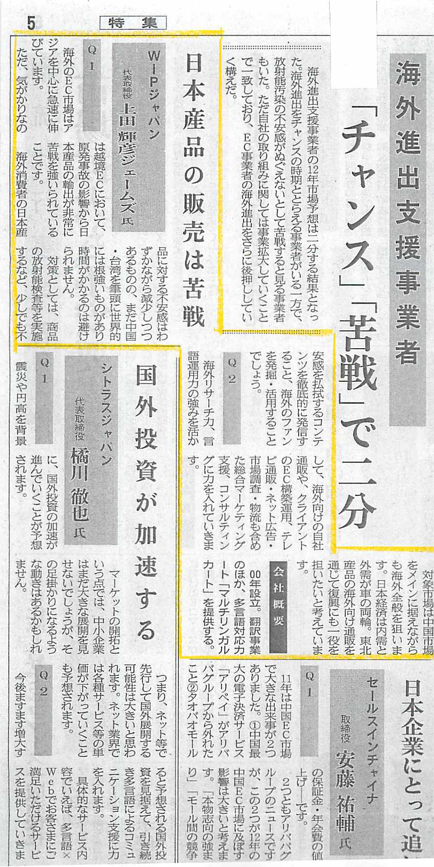同紙(2011年12月15日・22日合併号)、「2012年の業界予測-海外進出支援事業者」というコーナーで掲載いただきました。ありがたいことです。