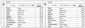 日経BP コンサルティングが発表した中国の企業ブランドイメージ調査によると、総合力ランキングで北京、上海ともにアップルがトップ。日本企業のブランドは、北京でソニーの24位、上海でキヤノンの10位がそれぞれ最上位らしい。