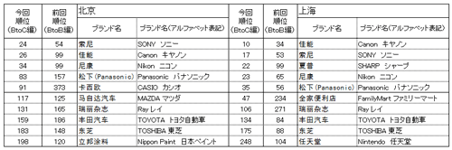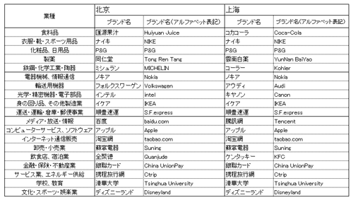 なお、「食料品」と「飲食店、宿泊業」では、北京では中国内資系の匯源果汁と全聚徳がそれぞれトップとなったのに対し、上海では外資系のコカコーラとケンタッキーがトップとなり、「食」に関する嗜好の違いが大きい。