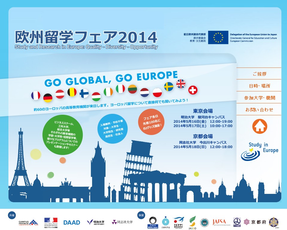 本日金曜日から2日間(5/16~17)明治大学にて、日曜日(5/18)は同志社大学にて、「欧州留学フェア2014」開催。